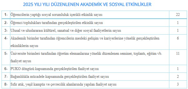 2025 YILI YILI DÜZENLENEN AKADEMİK VE SOSYAL ETKİNLİKLER| 1- | Öğrencilerin yaptığı sosyal sorumluluk içerikli etkinlik sayısı | 22 |